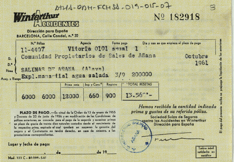 Recibo de 13.560 pesetas otorgado por Winterthur Accidentes, en favor de la Comunidad de Propietarios de sales de Salinas de Añana, por la liquidación de la póliza 11-4407 que expira en octubre de 1961