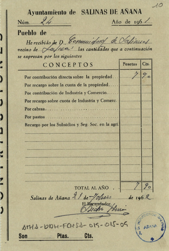 Recibo de 7,90 pesetas otorgado por Isidro Herrán como recaudador de impuestos del Ayuntamiento de Salinas de Añana, en favor de la Comunidad de Herederos de las salinas de dicha villa, correspondientes a la contribución directa sobre la propiedad de 1961