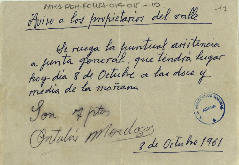 Recibo de 7 pesetas otorgado por Antolín Medoza por convocar a Junta general de Propietarios del Valle Salado de Añana