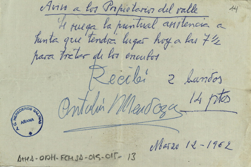 Recibo de 14 pesetas otorgado por Antolín Medoza, por dos bandos convocando a Junta de Propietarios del Valle Salado de Añana