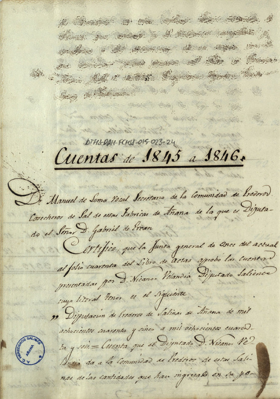 Documentos añadidos: 1.-Certificado del secretario de la Comunidad de Herederos de las salinas de Añana, Manuel de Loma Osorio, por el cual constataba la aprobación de la cuenta antecedente por la Junta de la dicha Comunidad. (1846, julio, 20; Salinas de Añana)