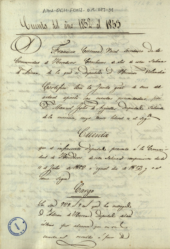 Cuenta dada por Manuel Félix de Argüelles, como Diputado de la Comunidad de Herederos de las salinas de Añana, comprendida desde el 11 de julio de 1852 hasta el 11 de julio de 1853