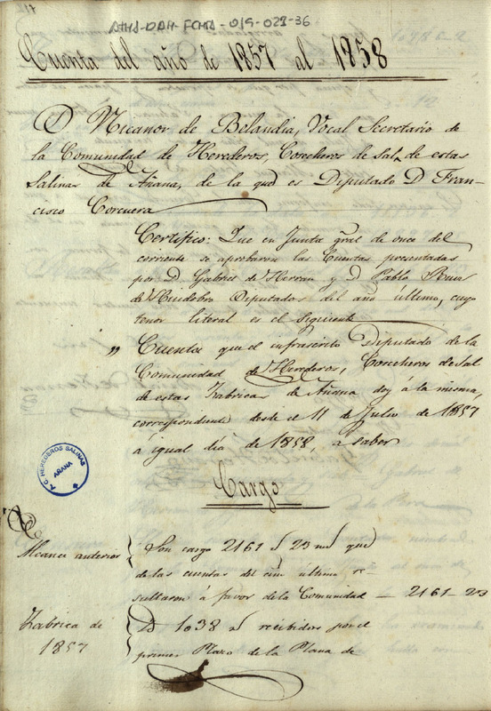Cuenta dada por Gabriel de Herrán y Pablo Ruiz de Huidobro, Diputados de la Comunidad de Herederos de las salinas de Añana, ante el Diputado entrante Francisco Corcuera, comprendida desde el 11 de julio de 1857 hasta el 11 de julio de 1858, resultando un alcance a favor de la dicha Comunidad de 2.951 reales y 12 maravedís de vellón
