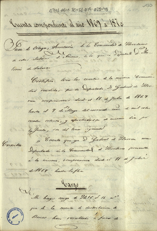 Cuenta dada por Gabriel de Herrán, Diputado de la Comunidad de Herederos de las salinas de Añana, comprendida desde el 11 de julio de 1869 hasta el 9 de mayo de 1870, resultando un alcance a favor de la dicha Comunidad de 894 reales y 21 céntimos