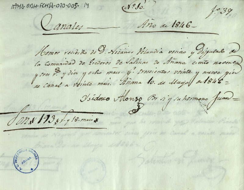 Recibo de 193 reales y 8 maravedíes otorgado por los hermanos Isidoro y Juan Alonso, en favor de Nicanor Belandia como Diputado de la Comunidad de Herederos de las salinas de Añana, por el suministro de 329 pies de canal para la expresada Comunidad durante el año 1846