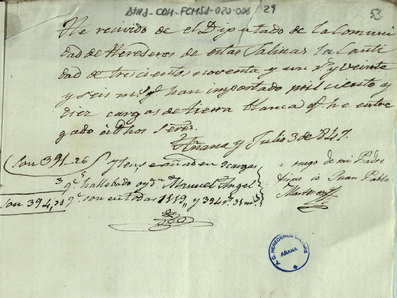 Recibo de 394 reales y 31 maravedíes otorgado por Juan Pablo Martínez en nobre de su padre y en favor del Diputado de la Comunidad de Herederos de las salinas de Añana, por el suministro para la expresada Comunidad de 1.119 cargas de tierra buena