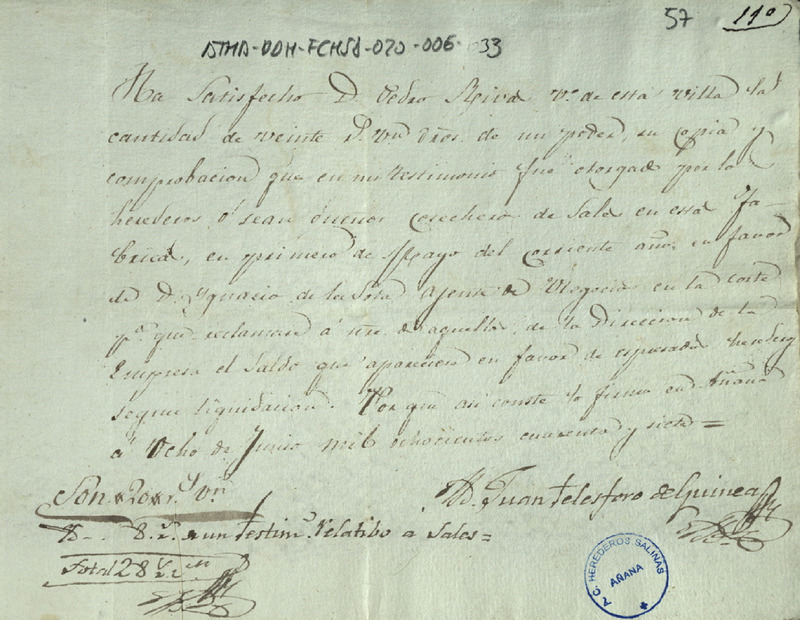 Recibo de 28 reales otorgado por Juan Telesforo de Guinea, por un poder, copia y comprobación que en un testimonio fue otorgado por los Herederos de las salinas de Añana en favor de Ignacio de la Sota para reclamar ente la Empresa del Arriendo de la Sal el saldo a favor de los expresados Herederos