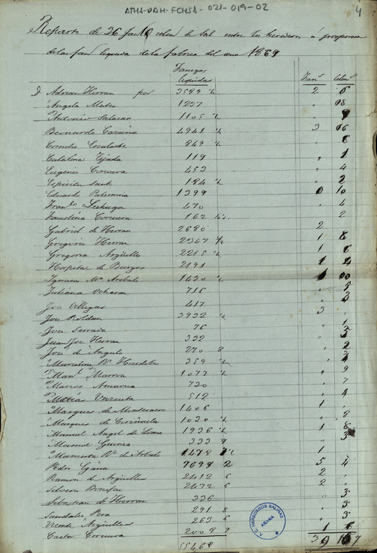 Reparto entre los Herederos de las salians de Añana de 36 fanegas y 16 celemines de sal entre los citados Herederos a proporción de las fanegas líquidas de 1869