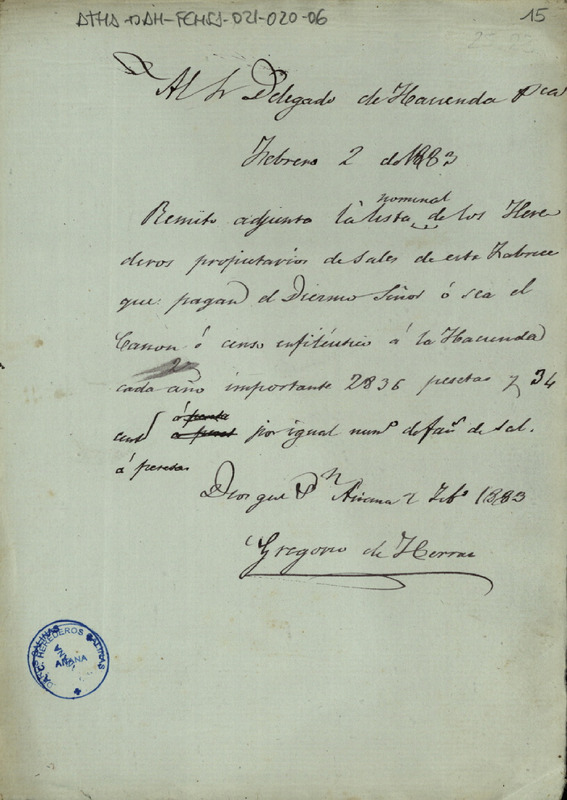 Borrador de una comunicación de Gregorio de Herrán al Delegado de Hacienda Pública, en la que decía remitir la lista de los Herederos que pagan el Diezmo Señor