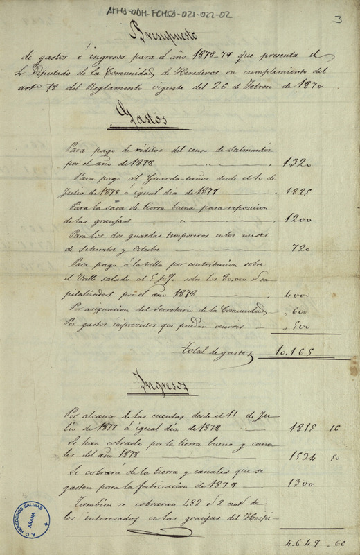 Presupuesto de ingresos y gastos de la Comunidad de Herederos de las salinas de Añana del año económico 1878-79, presentado por su Diputado en cumplimiento del artículo 18 del reglamento vigente del 26 de febrero de 1870
