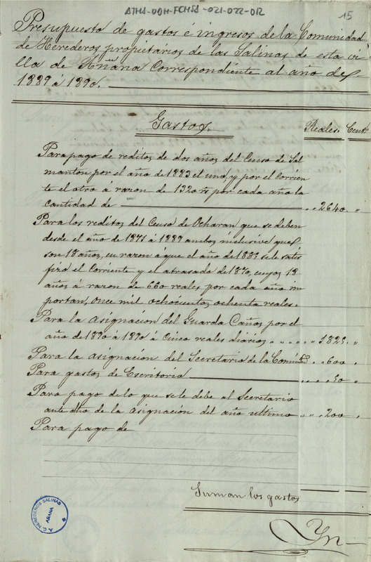 Presupuesto de ingresos y gastos de la Comunidad de Herederos de las salinas de Añana del año económico 1889-90