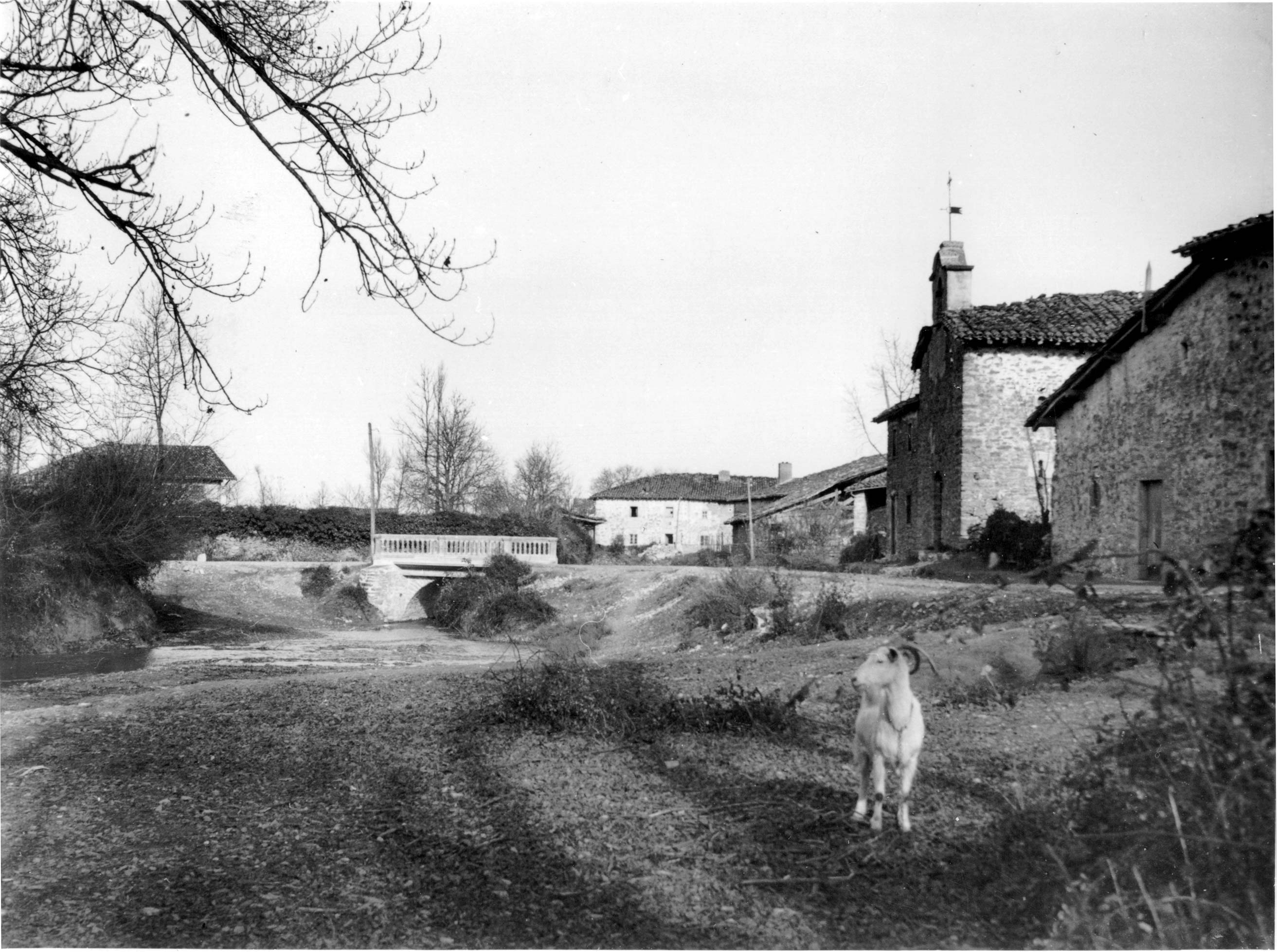 Vista lateral de una construcción rústica con bóveda de arista y una espadaña con un sólo hueco de campanas. En primer término, una cabra;