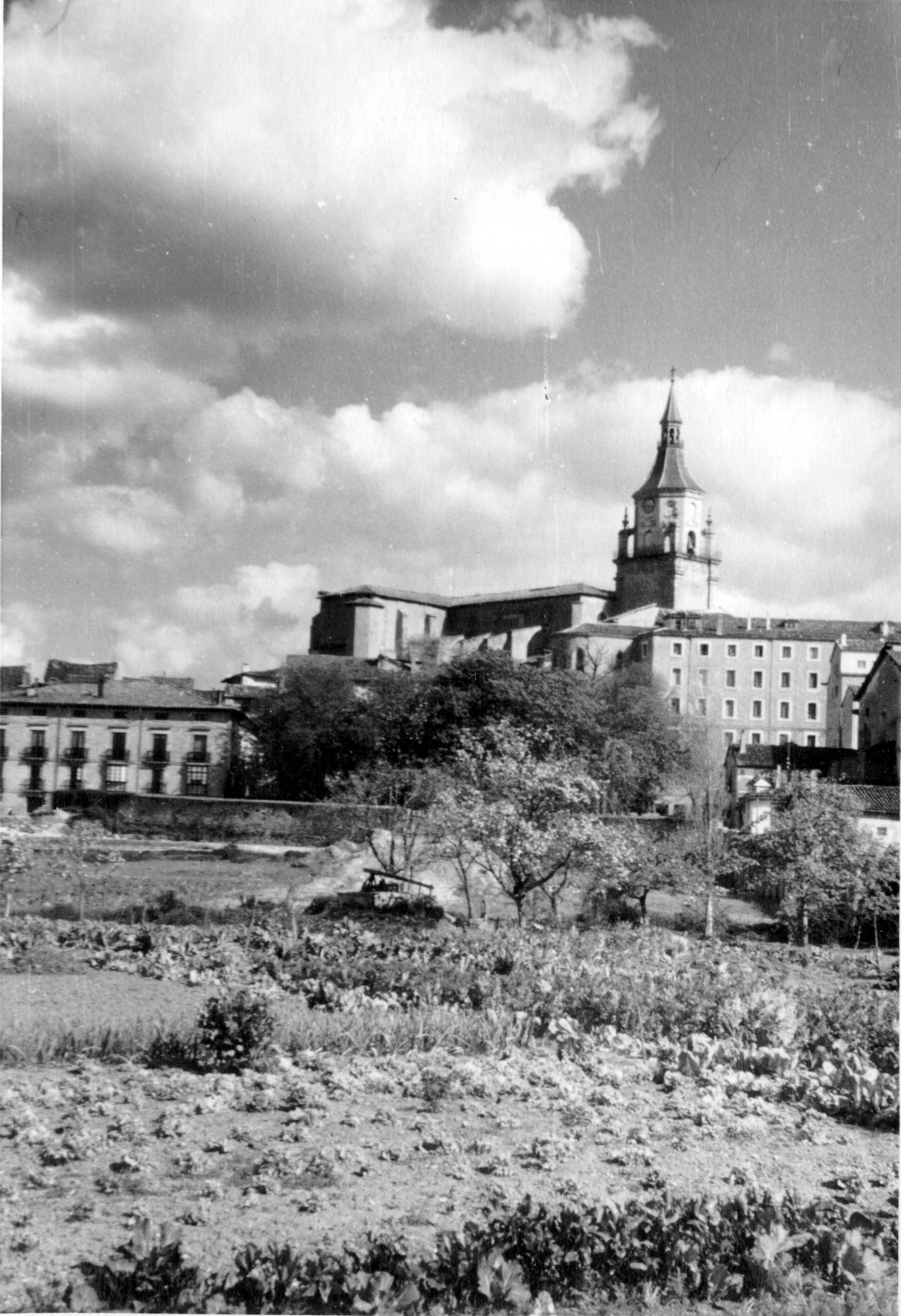 Vista parcial del conjunto urbano con la torre campanario de la Catedral de Santa María al fondo; en primer plano, una serie de huertas";