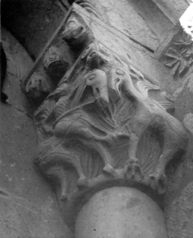 Vista de uno de los capiteles del ábside; se representa a un jinete en un caballo estilizado afrontando a un caballo alado con garras como patas. Presenta tres cabezas diabólicas en el cimacio";