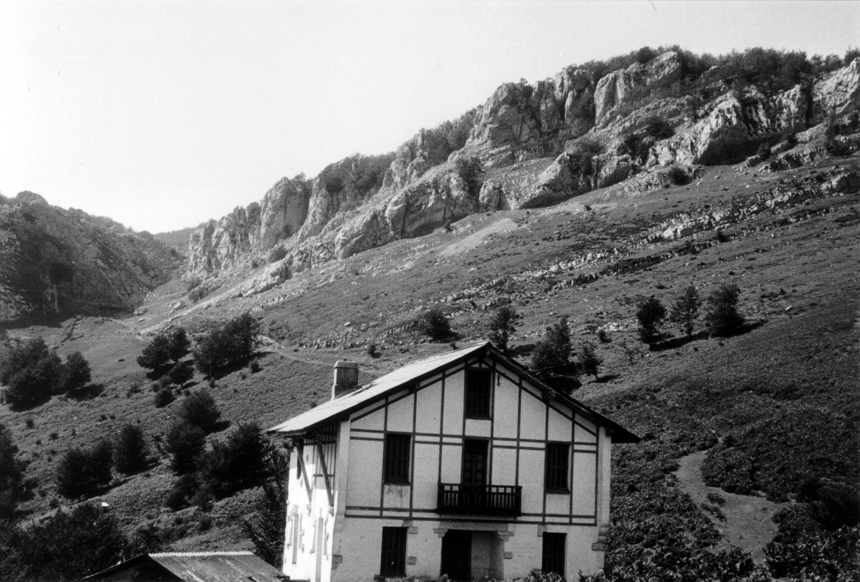 Vista frontal de un caserío aislado con el monte Alzania al fondo; es una construcción rural, con cubierta a dos aguas y una puerta sustentada por columnas clásicas con entablamento";