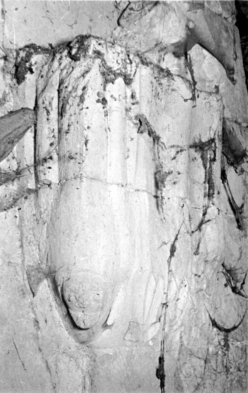 Vista del interior de la ermita de Nuestra Señora de Beolarra de Marquínez; presenta en primer plano una ménsula con forma de cabeza humana totalmente revestida de cal que actua como apoyo de un arco";