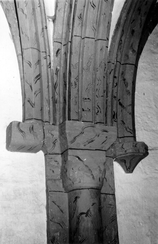 Vista frontal de las columnas que sustentan los arcos fajones de la ermita de Nuestra Señora de Beolarra de Marquínez; las medias columnas están adosadas a las pilastras y presentan capiteles con de coración vegetal muy estilizada y cabezas humanas con cabellos geometrizados