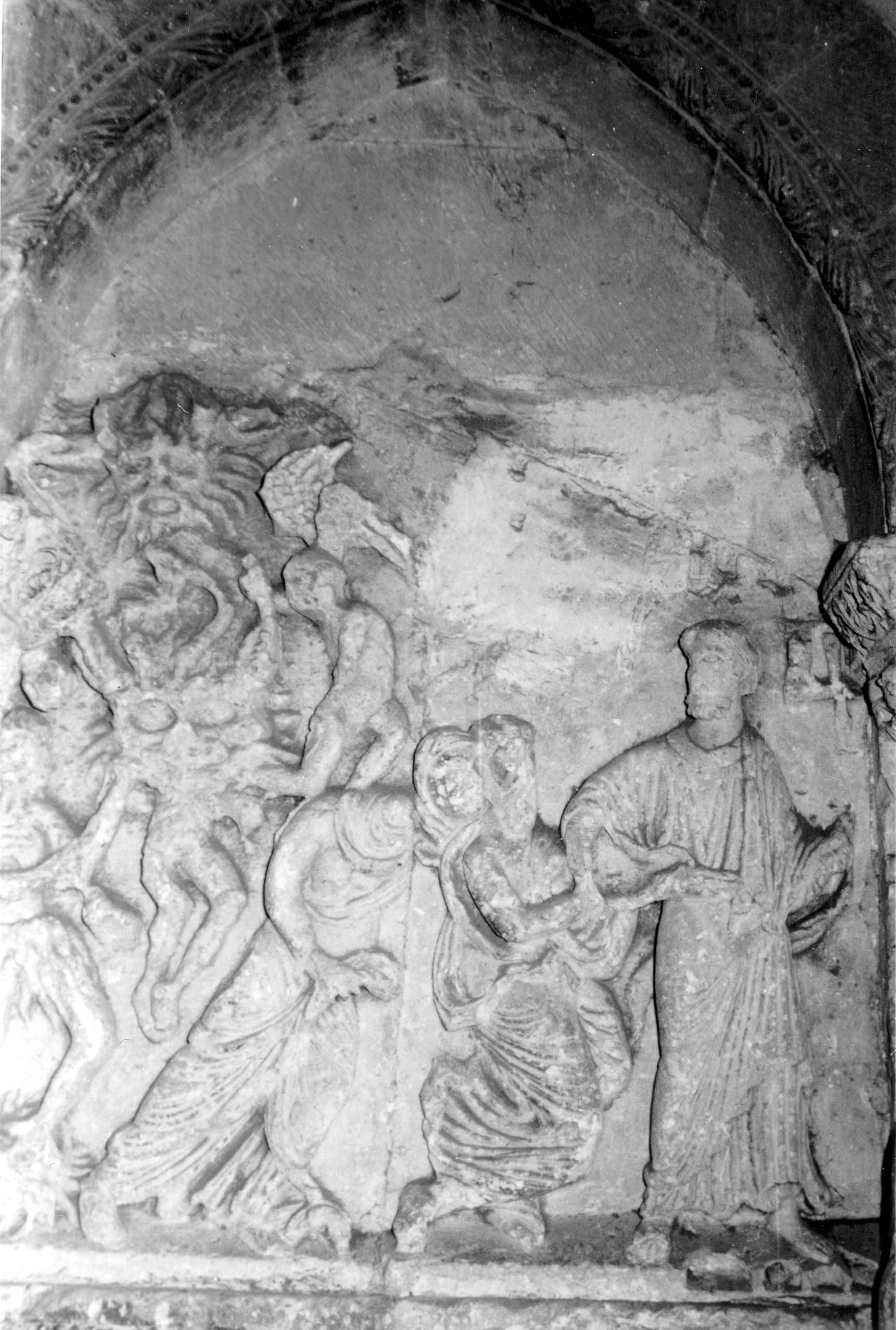 Vista frontal del relieve del fondo del pórtico que representa la Anastasis o la Bajada de Cristo a los Infiernos para sacar a los primeros padres. El relieve se realiza en dos placas de piedra, mal ajustadas, por lo que el escultor se ve obligado a forzar la anatomía de Eva. Detras de ellos, el Infierno representando en forma de cabezas monstruosas y figuras llameantes