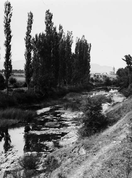 Perspectiva del río Zadora en época de estiaje. Al fondo, el pueblo de Arri aga, con la silueta de la torre de la iglesia de San Vicente Mártir;