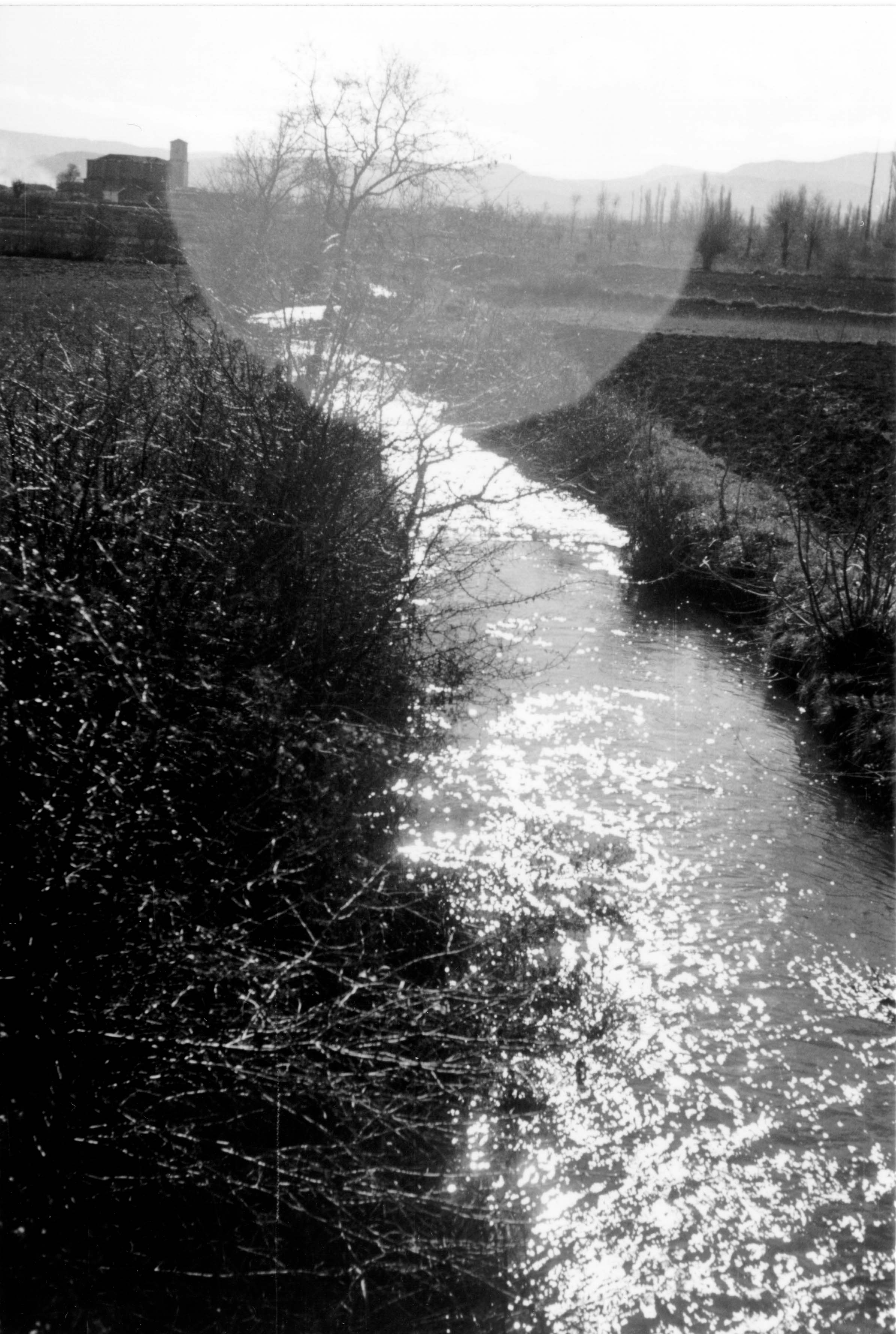 Un riachuelo de apreciable caudal discurre por un terreno llano en las prox imidades del monte San Vitor. A la izquierda se divisa la nave y campanario de un pueblo de la zona;